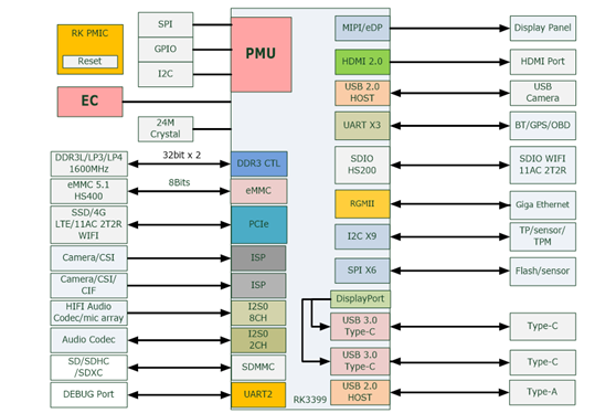 從RK3399硬件系統(tǒng)框架圖來看,開放接口極為豐富: