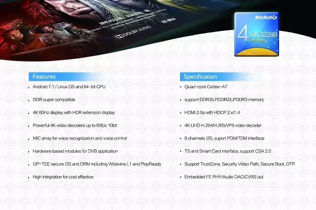 Rockchip提供的RK3288與RK3399均為高端盒子的選擇。可以支持4K高清視頻,同時(shí)支持包括游戲、VR等其他高品質(zhì)視頻需求。