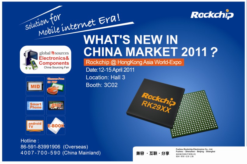 In April 12-15, 2011, Fuzhou Rockchip Electronics Co., Ltd. will join CSF HK. Rockchip will show its RK29XX terminal products based on android OS during this fair. Products include MID, smart phone, android TV and E-Book.