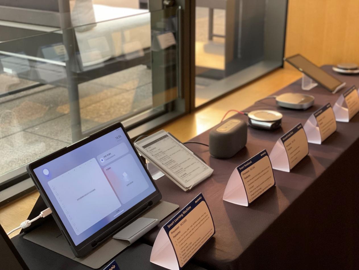 In the consumer electronics exhibition area, Rockchip's applications in smart office, smart education, and smart home are displayedthe Tablet embedded with the newly released AIoT chip RK3562 was on the spot, RK3562 features 4-core A53+G52, built in 1Tops computing power, and has 4K decoding capabilities, which can meet various smart devices; other smart devices such as: ARM PCs, notebooks, conference speakers, dictionary pens, E-learning machine, smart desk lamps, robots, Sweepers, etc. And other emerging consumer electronics also exhibited in the booth: mobile TVs, AR/VR, live-stream machine…